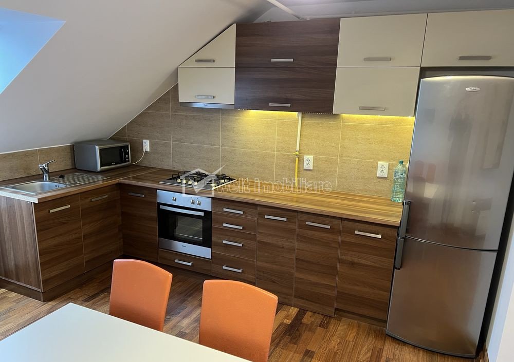+ 7 + 4 Inchiriat Caracteristici Tip locuinta Apartament Tip imobil bloc de apartamente Numar camere 2 Numar bucatarii 1 Numar bai 1 Parcare nu Supr. construita 78 m2 Suprafata utila 65 m2 Compartimentare Semidecomandat Confort Marit Etaj 4/4 Disponibilitate imediat Descrierea Apartamentului Oferim spre inchiriere un apartament cu 2 camere, situat in cartierul Buna Ziua din Cluj-Napoca, la doar cativa pasi de statia de autobuz. Detalii proprietate: - Suprafata utila: 65 mp - Etaj: mansarda (etaj 4 din 4) - Compartimentare semidecomandata: - Living open-space cu bucatarie - Dormitor - Dressing spatios - Baie Dotari: - Apartamentul se inchiriaza mobilat si utilat - Include frigider, masina de spalat haine si aer conditionat - Luminos si bine intretinut Avantaje: - Acces facil la mijloace de transport in comun - Zona linistita, aproape de magazine, farmacii si alte facilitati - Ideal pentru un cuplu sau o persoana singura Pentru mai multe detalii sau programarea unei vizionari, nu ezitati sa ne contactati. ID Proprietate - P47580 Utilitati, Finisaje Utilitati generale: Electricitate, Apa, Gaz, CanalizareSistem de incalzire Centrala termica, CalorifereClimatizare Aer conditionat Finisaje: Pereti (Vopsea lavabila, Faianta), Podele (Parchet, Gresie), Ferestre cu geam termopan (PVC) Dotari: Alte spatii utile (Terasa), Bucatarie (Mobilata, Utilata), Contorizare (Apometre, Contor gaz), Mobilat (Complet), Dotari imobil (Interfon), Electrocasnice (Masina de spalat rufe, Frigider, Aragaz, Cuptor microunde, Hota) Vecinatati si puncte de interes in zona Amenajare strazi (Asfaltate), Iluminat stradal, Mijloace de transport in comun Numar vizualizari: 429