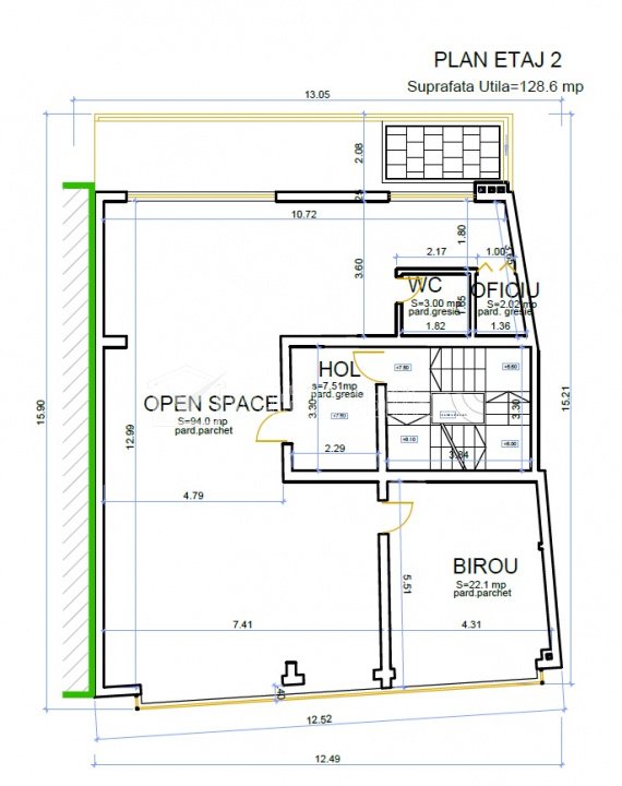 Spatiu birou sau servicii 128mp, Centru, cinema Victoria Cluj-Napoca, Centru 2 camere • 128 m2 pret chirie negociabil 1.280 €/luna + TVA 10 € /m2 + 6 + 3 Caracteristici Tip spatiu Birou Suprafata utila 128 m2 Nr. incaperi 2 Bai 2 Terase -- Nr. parcari -- Nr. garaje -- Tip imobil cladire de birouri Clasa birouri -- Etaj 2/3 Regim de inaltime 3E Constructie din Beton Anul constructiei -- Sup. construita 135 m2 Suprafata curte -- Disponibilitate imediat Descrierea spatiului Inchiriere spatiu pentru birou sau servicii, situat ultracentral langa cinema Victoria, blvd. Bucuresti. Imobil doar cu activitati de servicii si birou, etaj 2/3 Spatiul are configuratie sala foarte generoasa si o sala mai mica care se poate deschide (perete din rigips) sau se poate compartimenta dupa necesitati. 2 bai, Aer Conditionat, retea internet, iluminat LED. Potrivit pentru activitati de birou, educationale, recreative, etc. ID Proprietate - P51239 Utilitati Utilitati generale: Electricitate, Apa, Gaz, CanalizareSistem de incalzire: Centrala termica, CalorifereClimatizare: Aer conditionat Finisaje: Izolatii termice (Exterior), Podele (Parchet), Stare interior (Buna), Iluminat (Lampi, Spoturi, Aplice, Lumina naturala) Dotari: Contorizare (Nemobilat), Dotari imobil (Interfon) Vecinatati si puncte de interes in zona cinema Victoria, str. Baba Novac, teatrul national Numar vizualizari: 507 Actualizat: 2025-10-21 17:30:07