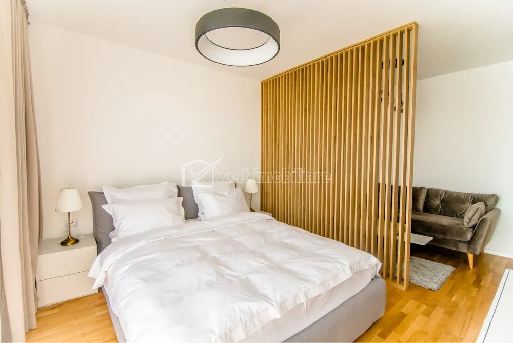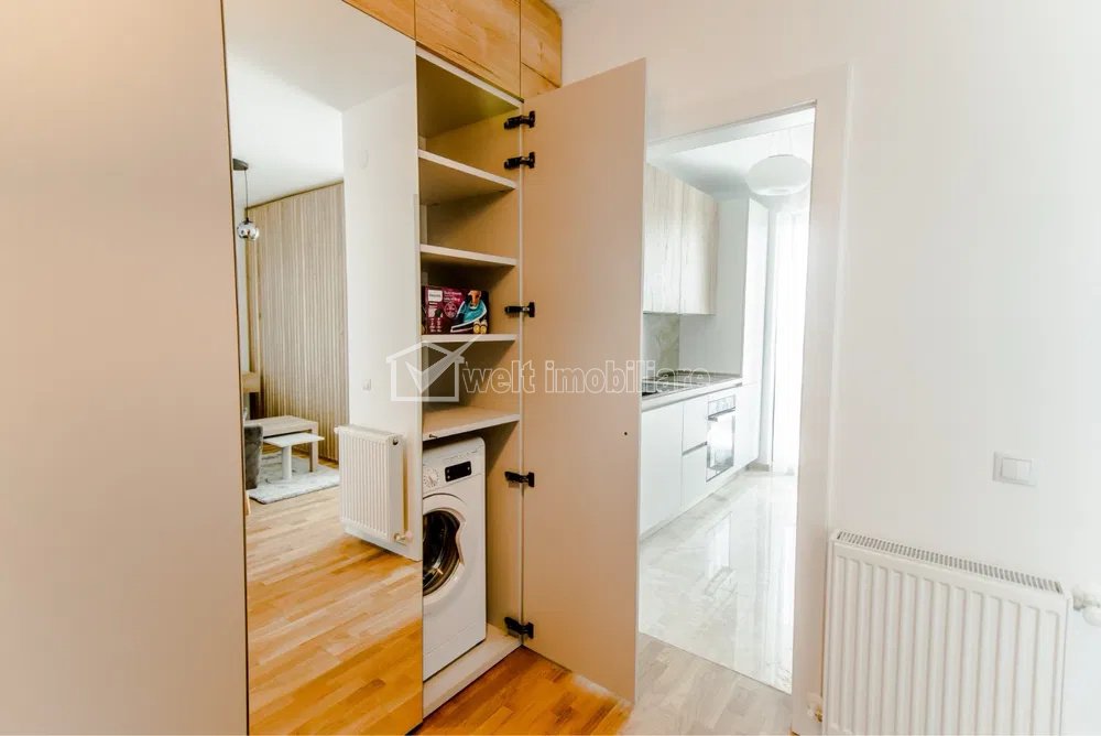 Characteristics Property type Apartment Rooms number 1 Kitchens number 1 Bathrooms number 1 Balconier number 1 Parking no Build area 51 m2 Ussefull area 37 sqm Divided Decomandat Floor 4/10 Build year 2020 Apartment Description Welt Imobiliare presents for rent a detached one-room apartment located in the Intre Lacuri neighborhood. The apartment is located on the 4th floor of a new building, arranged on 10 levels, with a usable area of approximately 37m² + 7m² terrace. The partitioning was designed as follows: - 1 elegant bedroom with double bed, sofa and desk - 1 kitchen, fully equipped - 1 spacious modern bathroom, equipped with a bathtub - spacious hallway with dressing room In addition, it benefits from a parking space included in the price. It is finished with quality materials and equipped with Italian imported furniture, Daikin air conditioning, Samsung TV, microwave oven, refrigerator, electric hob, electric oven, hood, coffee maker, washing machine, Buderus central heating, bed linen, towels. The apartment has a cozy design, is fully furnished, located in a quiet area, close to Iulius Mall, FSEGA and public transportation. Contact us for additional information or to arrange a viewing! Property ID - P48861 Utilities, Finishings General utilities: Electricity, Gaz, DrainHeating system HeatersConditioning Air conditioningFinishings Parquet, Sandstone, Faience, Washable, Interior doors Views number: 1002