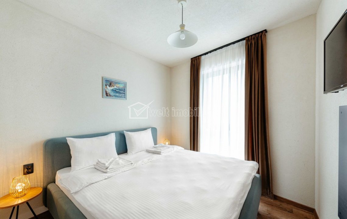 Characteristics Property type Apartment Rooms number 2 Kitchens number 1 Bathrooms number 1 Parking yes Build area 54 m2 Ussefull area 45 sqm Divided Semidecomandat Comfort Marit Floor 1/5 Build with Brick Apartment Description Welt Imobiliare offers for rent a modern and elegant apartment, located in the heart of Somesului Street, in a new 5-story building. With an area of 45 square meters, the apartment combines contemporary design with functionality, making it the perfect choice for those who want comfort and immediate access to all the city's amenities. Partitioning: - open space living room with fully furnished and equipped kitchen - double bedroom - modern bathroom with quality finishes Equipments and facilities included in the price: - central heating and underfloor heating - fully equipped kitchen (dishes, cutlery, microwave, refrigerator, electric hob, built-in electric oven, Nespresso espresso machine) - bed linen and towels - weekly cleaning included in the rental price on a mutually agreed date - parking space in underground parking (access by car lift) - high-speed WiFi internet (in the apartment and common areas) - Smart TV in the living area - hairdryer, iron and ironing board, slippers - video surveillance in common areas (interior-exterior) and in parking lots - secure access with yale smart (code and card) The ultra-central positioning is complemented by restaurants and terraces located in the immediate vicinity proximity, including on the ground floor of the aparthotel, offering added comfort and exclusivity. This apartment represents a rare opportunity on the market, ideal for those who want a premium lifestyle, with all the comfort and advantages of the city center. For more details or to schedule a viewing, the Welt Imobiliare team will be happy to assist you. Property ID - P49912 Utilities, Finishings General utilities: Electricity, Water, Gaz, DrainHeating system Heating, Floor HeatingFinishings Parquet, Sandstone, Faience, WashableEquipment Gas meters Views number: 1986