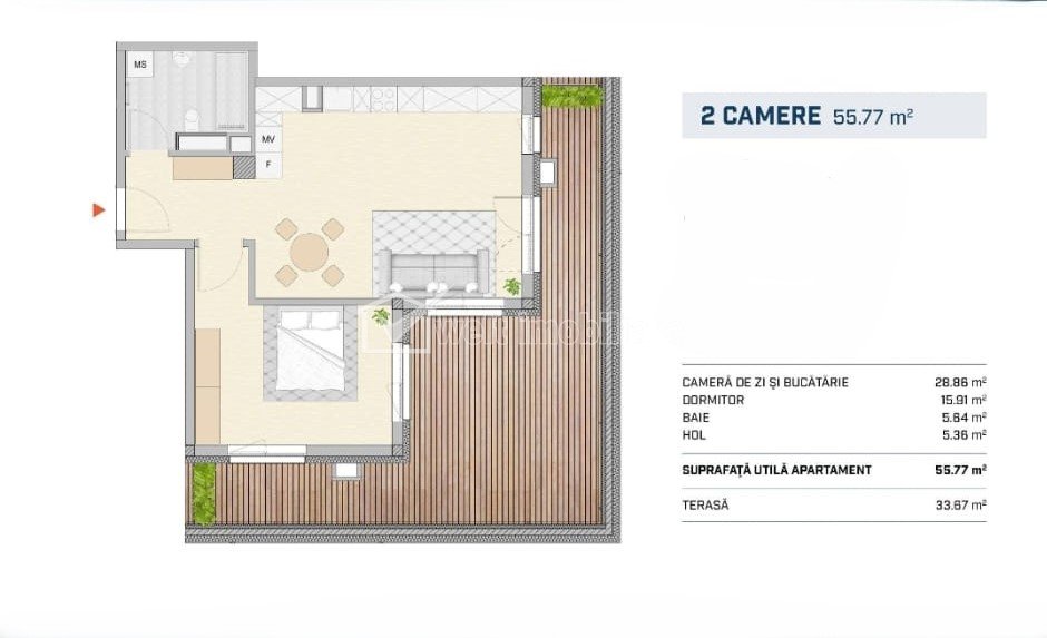 + 7 + 4 Rented Characteristics Property type Apartment Rooms number 2 Kitchens number 1 Bathrooms number 1 Terraces No. 1 Parking yes Build area 100 m2 Ussefull area 55.77 sqm Divided Semidecomandat Floor 6/6 Apartment Description Welt Imobiliare presents for rent a semi-detached two-room apartment located in the Liberty complex. The apartment is located on the 6th floor of a new building, arranged on 6 levels, with a usable area of approximately 56m² + 34m² terrace. The partitioning was designed as follows: - 1 open-space living room with kitchen - 1 bedroom - 1 spacious modern bathroom - spacious hallway with space for a dressing room In addition, it benefits from an underground parking space included in the price and a 34m² terrace. The apartment can be rented as office space or a home. It is rented unfurnished with underfloor heating and air conditioning. The building is on its first rental and there is the possibility of furnishing it if you want to rent it as a home. Contact us for additional information or to arrange a viewing! Property ID - P48951 Utilities, Finishings General utilities: Electricity, Gaz, DrainHeating system Floor HeatingConditioning Air conditioningFinishings Parquet, Sandstone, Faience, Washable, Interior doors Views number: 585