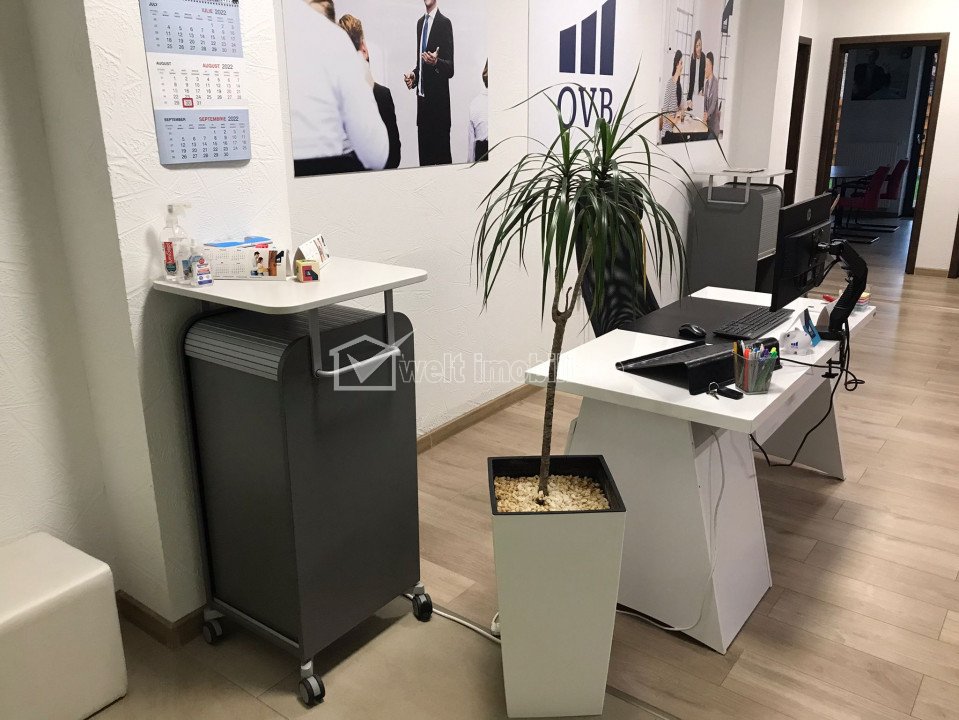 Office for rent in Cluj-napoca, zone Centru Cluj-Napoca, Centru 3 rooms • 87 sqm rent price €1,200/month 14 € /m2 + 5 Rented Characteristics Space type Office Ussefull area 87 sqm Rooms No. 3 Bathrooms 2 Terraces 1 Parking No. 1 Garages No. -- Imobil type cladire de birouri Offices class -- Floor ground floor/4 High regim 4E Building from Brick Build year 2020 Build area 105 m2 Yard area -- Utilities General utilities: Electricity, Water, Gaz, Drain, TV CableHeating system: Heating, Heaters Finishings: Parquet Views number: 328 Updated: 2025-09-17 14:52:24