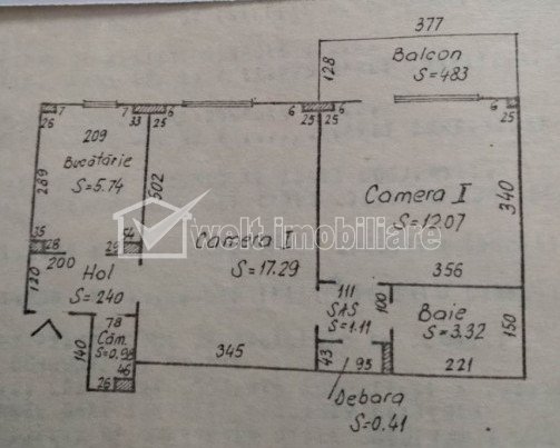 Characteristics Property type Apartment Rooms number 2 Kitchens number 1 Bathrooms number 1 Balconier number 1 Parking no Build area 57 m2 Ussefull area 44 sqm Divided Semidecomandat Comfort 1 Floor 7/10 Build with Brick Build year 1977 Apartment Description Real estate Agency Welt Imobiliare is offering for sale apartment with 2 rooms, located in Cluj-napoca, zone Gheorgheni. The apartment comfort 1 semidecomandat situated in floor 7 in a bloc with 10 floors, has 1 kitchen, 1 bathroom , 1 balcony .The apartment is necesita renovare has parquet, sand stone, washable walls, gas counters. Among finishing there are: izolatii termice (bloc izolat termic), pereti (vopsea lavabila, var), podele (parchet, gresie), stare interior (necesita renovare), usa intrare (metal) Among equipment we are mentioning: contorizare (contor caldura, contor gaz), dotari imobil (interfon, lift) Property ID - P38214 Utilities, Finishings General utilities: Electricity, Water, Gaz, DrainHeating system District heating, HeatersFinishings Parquet, Sandstone, WashableEquipment Gas meters Views number: 1556 Updated: 2023-12-27 16:42:24