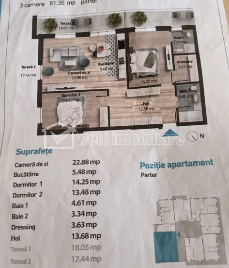 Characteristics Property type Apartment Rooms number 3 Kitchens number 1 Bathrooms number 1 Terraces No. 2 Garrages number 1 Parking yes Build area 133 m2 Ussefull area 82 sqm Divided Semidecomandat Comfort 1 Floor ground floor/8 Build with Brick Build year 2020 Apartment Description Real estate Agency Welt Imobiliare is offering for sale apartment with 3 rooms, located in Cluj-napoca, zone Zorilor. The apartment comfort 1 semidecomandat in a bloc with 8 floors, has 1 kitchen, 1 bathroom , parking. has heat station, gas counters. Among finishing there are: izolatii termice (bloc izolat termic), ferestre cu geam termopan (pvc), usa intrare (metal) Among equipment we are mentioning: alte spatii utile (terasa, boxa la subsol), contorizare (apometre, contor gaz), mobilat (nemobilat), dotari imobil (interfon, lift) Property ID - P34044 Utilities, Finishings General utilities: Electricity, Water, Gaz, DrainHeating system Heating, Floor HeatingEquipment Gas meters Views number: 1560 Updated: 2023-02-04 13:36:12