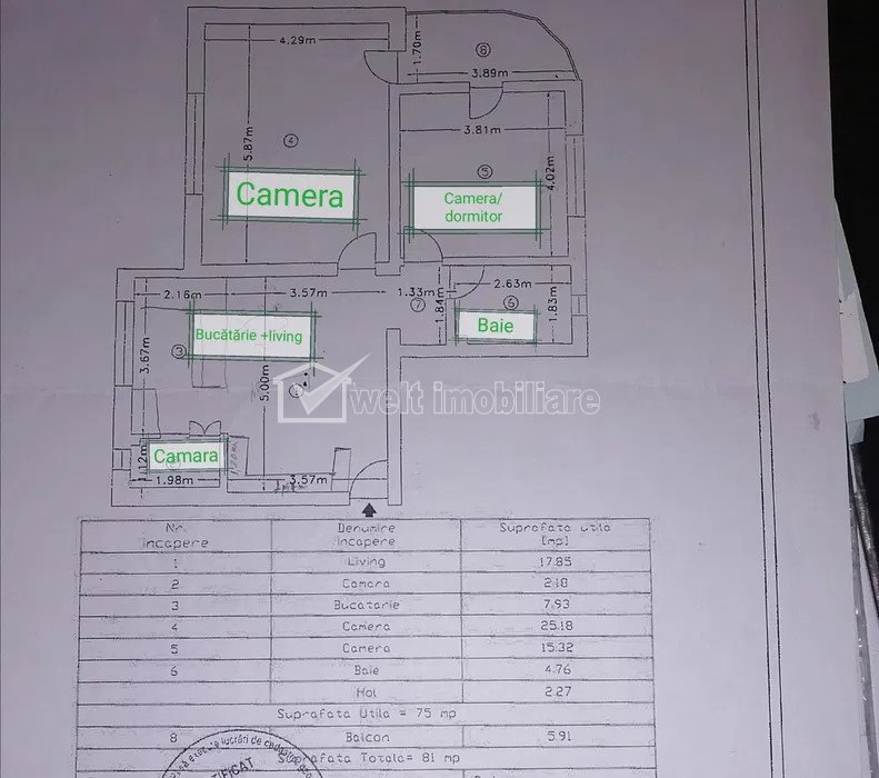 + 4 Sold Characteristics Property type Apartment Rooms number 3 Kitchens number 1 Bathrooms number 1 Balconier number 1 Parking no Build area 90 m2 Ussefull area 75 sqm Divided Semidecomandat Comfort 1 Floor ground floor/3 Build with Brick Build year 2008 Apartment Description Real estate Agency Welt Imobiliare is offering for sale apartment with 3 rooms, located in Floresti. The apartment comfort 1 semidecomandat in a bloc with 3 floors, has 1 kitchen, 1 bathroom , 1 balcony .The apartment is finisat has parquet, sand stone, faience, washable walls, interior doors, TV cable, heat station, gas counters. Among finishing there are: izolatii termice (bloc izolat termic), pereti (vopsea lavabila, faianta), podele (parchet, gresie), ferestre cu geam termopan (pvc), usa intrare (metal), usi interior (lemn) Among equipment we are mentioning: bucatarie (mobilata, utilata), contorizare (apometre, contor gaz), mobilat (complet), dotari imobil (interfon), electrocasnice (masina de spalat rufe, frigider, aragaz, tv, hota) Property ID - P38737 Utilities, Finishings General utilities: Electricity, Water, Gaz, Drain, TV CableHeating system Heating, HeatersFinishings Parquet, Sandstone, Faience, Washable, Interior doorsEquipment Gas meters Views number: 1249 Updated: 2023-11-27 09:34:39