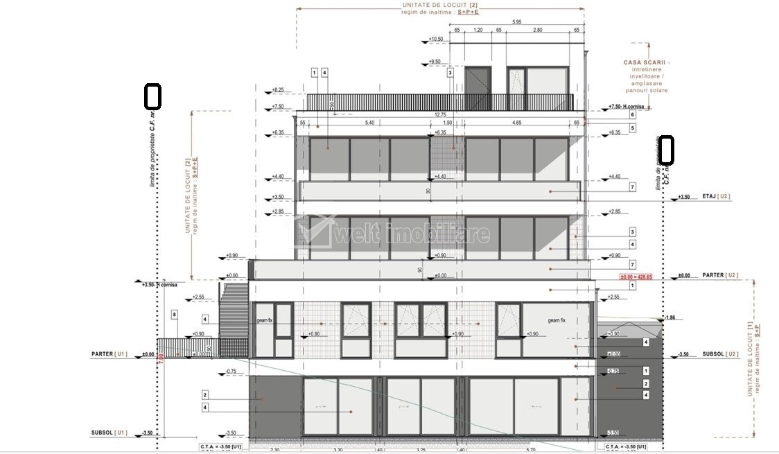 + 7 + 4 Characteristics Property type House Imobil type Two-ply Rooms number 4 Kitchens number 1 Bathrooms number 3 Balconier number 3 Terraces No. 2 Terraces area 90.00 mp Garrages number 1 Parking yes Cellar no Garden no Ussefull area 246 sqm Build area 380 sqm Land area 90 m2 Front 18 m Floor 1 Struct. strength Brick Build year 2025 Finishings: TV