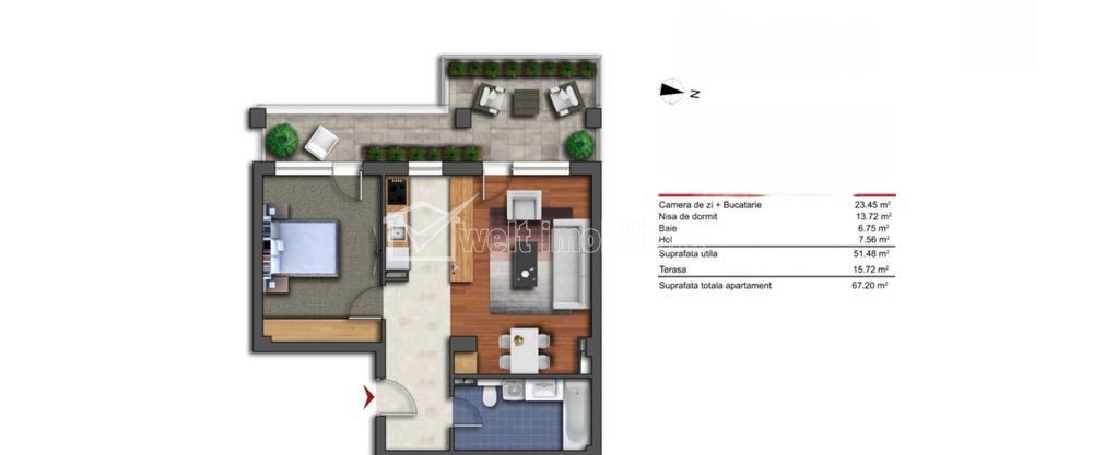 Caracteristici Tip locuinta Apartament Tip imobil bloc de apartamente Numar camere 2 Numar bucatarii 1 Numar bai 1 Numar terase 1 Parcare da Supr. construita 68 m2 Suprafata utila 52 m2 Compartimentare Semidecomandat Confort 1 Etaj 5/5 Construit cu Caramida Disponibilitate imediat Descrierea Apartamentului Oferim spre vânzare un apartament modern, situat în complexul rezidențial Junior Residence. Această locuință este ideală pentru tineri profesioniști sau cupluri care caută un cămin confortabil și bine situat, cu finisaje de calitate și un design contemporan. Caracteristici principale: Compartimentare inteligentă: Spațiu generos ce include living luminos, dormitor confortabil, bucătărie modernă și baie complet utilată. In plus, o terasa ideala pentru relaxare. Suprafață utilă: 52 mp + 16 mp terasa. Finisaje premium: Materiale moderne și atenție la detalii, asigurând un ambient primitor și gata de locuit. Beneficii: Localizare excelentă: Amplasat într-un complex rezidențial de prestigiu, cu acces rapid la transportul public, centre comerciale, instituții de învățământ și zone verzi. Investiție sigură: O proprietate într-o zonă în continuă dezvoltare, cu potențial de apreciere a valorii. Confort urban: Un mediu modern și relaxant, ideal pentru traiul cotidian. Posibilitatea achizitionarii unei parcari subterane, pentru un plus de confort. Pentru mai multe informații sau pentru a programa o vizionare, vă rugăm să ne contactați ID Proprietate - P46230 Utilitati, Finisaje Utilitati generale: Electricitate, Apa, Gaz, CanalizareSistem de incalzire Centrala termica Finisaje: Izolatii termice (Bloc izolat termic), Pereti (Vopsea lavabila, Faianta), Podele (Parchet, Gresie), Usa intrare (Metal) Dotari: Bucatarie (Mobilata, Utilata), Contorizare (Apometre, Contor gaz), Dotari imobil (Interfon, Lift) Vecinatati si puncte de interes in zona Auchan IRIS Amenajare strazi (Asfaltate, Betonate), Iluminat stradal, Mijloace de transport in comun Numar vizualizari: 480 Actualizat: 2025-03-17 12:17:19