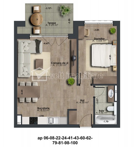 + 7 + 4 Vandut Caracteristici Tip locuinta Apartament Tip imobil bloc de apartamente Numar camere 2 Numar bucatarii 1 Numar bai 1 Numar balcoane 1 Parcare nu Supr. construita 65 m2 Suprafata utila 53 m2 Compartimentare Semidecomandat Confort 1 Etaj 4/6 Construit cu Caramida An constructie 2021 Descrierea Apartamentului Welt Imobiliare intermediaza vanzarea de apartamente cu 2 si 3 camere, intr-un ansamblu rezidential deosebit, aflat in constructie in zona The Office - BRD Marasti. Imobilul imbina cu succes spatiile de locuit cu cele comerciale, de relaxare si office. Se va evidentia prin crearea unei gradini in curtea imobilului si a roof-top-ului cu acces pentru locatarii imobilului, in vederea recrearii, relaxarii sau petrecerii timpului. Preturile afisate nu contin TVA si sunt valabile pentru plata unui avans de minim 80%. De asemenea, in functie de etajul ales, pretul creste proportional cu etajul. Avansul minim acceptat este de 30 %, la pret de lista fix. Apartamentele de 2 camere au suprafete intre 51 si 57 mp utili si se vand semifinisate cu urmatoarele dotari: -pereti gletuiti cu un singur strat de glet -instalatii termice, electrice si sanitare executate si trase la pozitie -incalzire in pardoseala -centrala termica comuna -tamplarie PVC, 6 camere, bagheta calda, 3 foi de sticla -terasele complet finisate -usa metalica antiefractie cu inchidere in 9 puncte si izolare fonica si termica -acces securizat in cladire -videointerfon -posibilitatea de finisare de catre dezvoltator a apartamentelor Spatii comune: -gradina interioara amenajata cu spatii verzi si locuri de joaca pentru copii (gradina va fi organizata in 3 zone cu spatii amenajate pentru copii in functie de varste: o zona pentru copii mai mici de 5 ani, o zona pentru copii mai mari de 5 ani, o zona pentru adulti) -spatiu multifunctional la parter pus la dispozitia comunitatii (loc de joaca pentru copii, loc pentru organizat evenimente si intalniri, loc pentru organizarea de zile de nastere, etc) -The Roof Top- terasa de la etajul 7 al cladirii cu suprafata de 500 mp, amenajat cu zone de relaxare, barbeque, pergole si spatii verzi, pusa la dispozitia comunitatii. -parking subteran cu control acces (pretul unui loc de parcare fiind de 8.500 euro +tva) -zona de promenada -spatii comerciale la parter -zona de birouri ID Proprietate - P15534 Utilitati, Finisaje Utilitati generale: Electricitate, Apa, CanalizareSistem de incalzire Centrala de imobil, Incalzire in pardoseala Finisaje: Izolatii termice (Exterior), Stare interior (Semifinisat), Ferestre cu geam termopan (PVC), Usa intrare (Metal) Dotari: Dotari imobil (Videointerfon, Lift, Spatii agrement, Curte, Gradina) Vecinatati si puncte de interes in zona The Office, BRD Marasti Amenajare strazi (Asfaltate), Iluminat stradal Numar vizualizari: 5324 Actualizat: 2021-05-08 12:07:52