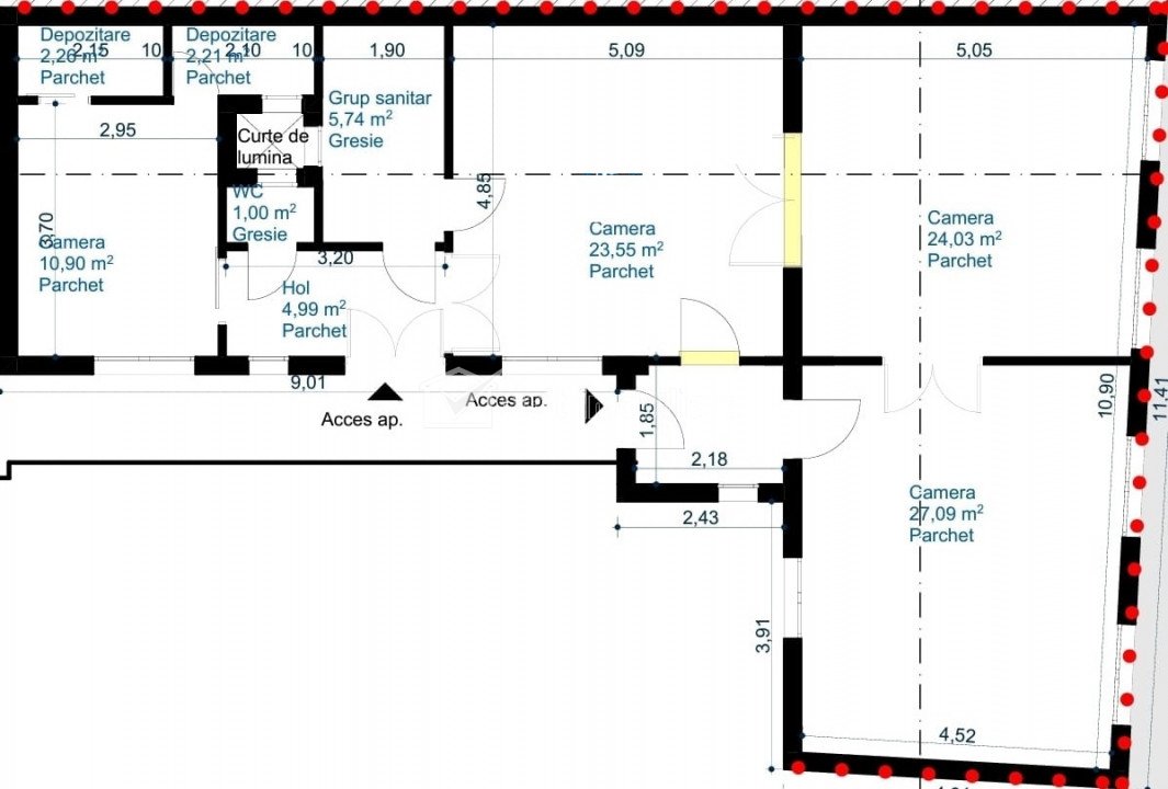 Caracteristici Tip locuinta Apartament Tip imobil casa/vila Numar camere 3 Numar bucatarii 1 Numar bai 2 Numar terase 1 Parcare nu Supr. construita 137 m2 Suprafata utila 119 m2 Compartimentare Semidecomandat Confort 1 Etaj 1/1 Construit cu Caramida Disponibilitate Imediat Descrierea Apartamentului Welt Imobiliare va propune spre vanzare un apartament intr-o locatie de top. Apartamentul se afla intr-una din cele mai bune zone ultracentrale ale Clujului. Suprafata utila este de 119 mp care sunt compartimentati in: - bucatarie - 10.90 mp - camera 1 - 27.09 mp - camera 2 - 24.03 mp - camera 3 - 23.55 mp - spatiu depozitare - spatiu depozitare - baie mare - baie mica - hol mare - hol mic - pivnita. Are 2 intrari separate. Apartamentul este modular, poate fi impartit in 2 apartamente mai mici, fiecare cu intrare separata. Apartamentul necesita renovare. Se poate folosi ca si locuinta proprie dar este ideal si pentru inchiriere in regim hotelier, spatiu de birouri etc. Pentru cei care sunt in cautarea unei locatii de prestigiu, aceasta proprietate va satisface dorintele! Locatia confera stabilitate si siguranta investitiei in orice conditii de piata. Pentru detalii si vizionari va asteptam sa ne contactati! ID Proprietate - P33967 Utilitati, Finisaje Utilitati generale: Electricitate, Apa, Gaz, Canalizare Finisaje: Pereti (Var, Faianta), Podele (Parchet, Gresie), Stare interior (Necesita renovare), Ferestre cu geam termopan (Lemn), Usa intrare (Lemn), Usi interior (Lemn) Dotari: Alte spatii utile (WC Serviciu, Debara), Contorizare (Apometre, Contor gaz), Mobilat (Nemobilat), Dotari imobil (Acoperis, Curte comuna) Vecinatati si puncte de interes in zona Amenajare strazi (Asfaltate), Iluminat stradal, Mijloace de transport in comun Numar vizualizari: 2624 Actualizat: 2023-07-17 16:37:04