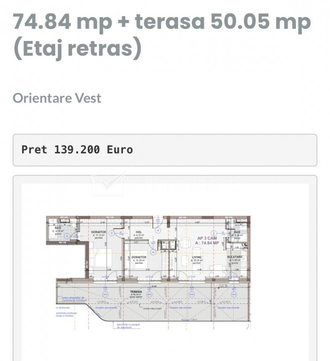 Apartament tip Penthouse, Eroilor Floresti Floresti, zona Eroilor 3 camere • 74.48 m2 • 2 bai • etaj 7/6 • semidecomandatnemobilat pret vanzare 139.200 € Caracteristici Tip locuinta Apartament Tip imobil bloc de apartamente Numar camere 3 Numar bucatarii 1 Numar bai 2 Numar balcoane 1 Numar terase 1 Parcare nu Supr. construita 138 m2 Suprafata utila 74.48 m2 Compartimentare Semidecomandat Confort 1 Etaj 7/6 Construit cu Caramida An constructie 2025 Disponibilitate imediat Descrierea Apartamentului Va propunem un nou proiect imobiliar situat in zona centrala a Florestiului, pe strada Eroilor, in apropierea viitorului mall. Proiectul este compus din 2 imobile, cu un regim de inaltime de S+P+7E+Er, prevazut cu spatii comerciale la parter, spatii verzi, alei pietonale. Blocurile sunt din caramida si sunt prevazute cu centrala termica individuala pe fiecare apartament, incalzire in pardoseala, geamuri tripan, usa antiefractie, lift. Apartamentele se predau la stadiul semifinisat. Preturile afisate includ TVA inclus. Contra cost, se poate opta pentru parcare subterana. Termen de finalizare: aprilie 2026. ID Proprietate - P49884 Utilitati, Finisaje Utilitati generale: Apa, Gaz, CanalizareSistem de incalzire Centrala termica, Incalzire in pardoseala Finisaje: Izolatii termice (Exterior), Usa intrare (Metal) Dotari: Alte spatii utile (WC Serviciu), Contorizare (Apometre, Contor gaz), Mobilat (Nemobilat), Dotari imobil (Interfon, Lift) Vecinatati si puncte de interes in zona Amenajare strazi (Asfaltate), Iluminat stradal, Mijloace de transport in comun Numar vizualizari: 506 Actualizat: 2025-11-10 14:16:28
