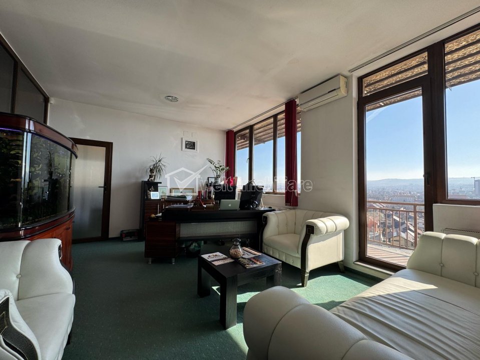 Apartament 4 camere, ultrafinisat, mobilat pentru birou, panorama unica ! Cluj-Napoca, Iris 4 camere • 119 m2 • 2 bai • etaj 5/5 • semidecomandatfinisat • mobilat complet pret vanzare 327.500 € + TVA + 24 + 21 Caracteristici Tip locuinta Apartament Tip imobil bloc de apartamente Numar camere 4 Numar bucatarii 1 Numar bai 2 Numar balcoane 1 Numar garaje 1 Parcare nu Supr. construita 180 m2 Suprafata utila 119 m2 Compartimentare Semidecomandat Confort Marit Etaj 5/5 Construit cu Caramida An constructie 2016 Disponibilitate imediat Descrierea Apartamentului Welt Imobiliare intermediaza vanzarea unui spectaculos apartament de 4 camere, situat in zona Iris, aproape de viitorul mall RIVUS. Imobilul face parte dintr-un complex privat de 6 imobile nou construite, cu teren imprejmuit si bariera de acces in incinta. Este apartamentul ideal pentru cei care isi doresc un spatiu de birou generos, finisaje si dotari moderne, precum si o priveliste impresionanta asupra orasului ! Apartamentul dispune de o suprafata utila de 119 mp, doua terase generoase de 16 mp, si orientare sudica, care iti asigura lumina naturala pe tot parcursul zilei. Se vinde complet mobilat si utilat ca spatiu de birou, insa este un apartament ideal si pentru locuit. Optional, se poate achizitiona si loc de parcare subteran, la pretul de 8.000 euro + TVA. ID Proprietate - P48417 Utilitati, Finisaje Utilitati generale: Electricitate, Apa, Gaz, CanalizareSistem de incalzire Centrala termica, CalorifereClimatizare Aer conditionat Finisaje: Izolatii termice (Exterior, Bloc izolat termic), Pereti (Vopsea lavabila, Faianta), Podele (Parchet, Gresie), Ferestre cu geam termopan (PVC), Usa intrare (Metal), Usi interior (Lemn) Dotari: Mobilat (Complet), Dotari imobil (Interfon, Lift, Spatii agrement, Curte comuna), Electrocasnice (Masina de spalat rufe, Frigider, Masina de spalat vase, TV, Hota) Vecinatati si puncte de interes in zona RIVUS MALL, GARA CLUJ, DEDEMAN Amenajare strazi (Asfaltate), Iluminat stradal, Mijloace de transport in comun Numar vizualizari: 1068 Actualizat: 2025-11-13 13:37:06