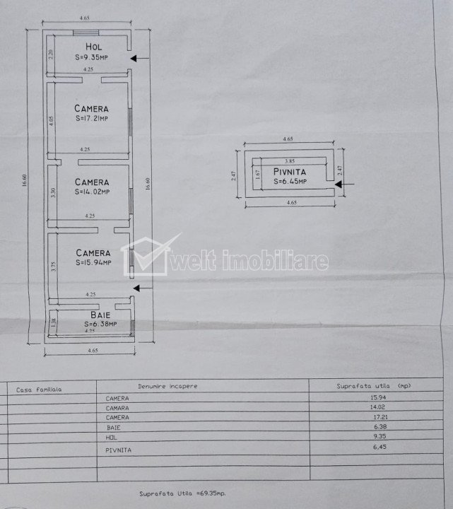 + 2 Vandut Caracteristici Tip locuinta Casa Numar camere 3 Numar bucatarii 1 Numar bai 1 Parcare nu Beci da Gradina nu Suprafata utila 70 m2 Suprafata construita 76 m2 Suprafata teren 139 m2 Front 7.4 m Struct. rezistenta Caramida An constructie 1952 Disponibilitate imediat Descrierea Casei Welt Imobiliare va ofera spre vanzare o proprietate cu 3 camere intr-o zona linistita din cartierul Gruia, foarte aproape de Belvedere/Cetatuie. Suprafata totala a imobilului este de 76 mp construiti si 139 mp teren, si e compartimentat in 3 camere, baie, hol si pivnita. Imobilul necesita renovare! E racordat la utilitati, trebuie doar refacute contractele, nefiind locuit de mult timp. Pentru mai multe detalii va stam cu drag la dispozitie. ID Proprietate - P39561 Finisaje Stare interior (Necesita renovare) Vecinatati si puncte de interes in zona Amenajare strazi (Asfaltate), Iluminat stradal, Mijloace de transport in comun Numar vizualizari: 996 Actualizat: 2024-01-30 18:20:18