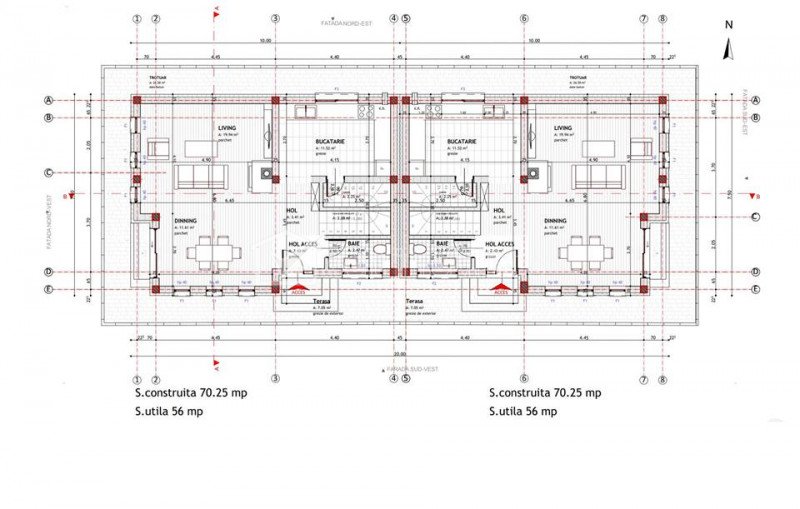 + 5 Vandut Caracteristici Tip locuinta Casa Tip imobil Duplex Numar camere 4 Numar bucatarii 1 Numar bai 3 Parcare da Beci nu Gradina nu Suprafata utila 119 m2 Suprafata construita 140 m2 Suprafata teren 250 m2 Front 14 m Etaj 1 Struct. rezistenta Caramida An constructie 2019 Disponibilitate 31.12.2019 Descrierea Casei Va prezentam spre vanzare un ansamblu de case de tip duplex situat intr-una dintre cele mai bune zone din Floresti. Casele vor avea un regim de inaltime P+1E si o suprafata utila de 119 mp, amplasate pe un teren cu suprafata de 250 mp. Compartimentarea este forte practica si moderna: -parterul este compus din living +dinning (loc de luat masa), bucatarie, baie si un hol; atat din living cat si din dinning exista acces in curte; -etajul casei este alcatuit din 3 dormitoare, 2 bai si un hol; dormitorul matrimonial este cu dressing si baie proprie. Se predau la stadiul semifinisat cu centrala termica proprie si calorifere, existand posibilitatea si de incalzire in pardoseala. Se accepta plata cash cat si prin credit bancar, iar rezervarea se face contra sumei de 3.000 EUR. ID Proprietate - P16582 Finisaje Izolatii termice (Exterior), Stare interior (Necesita renovare), Ferestre cu geam termopan (PVC), Usa intrare (Metal) Vecinatati si puncte de interes in zona Vivo Center, Practiker, Profi Amenajare strazi (Asfaltate), Iluminat stradal, Mijloace de transport in comun Numar vizualizari: 4367 Actualizat: 2023-07-14 17:39:35
