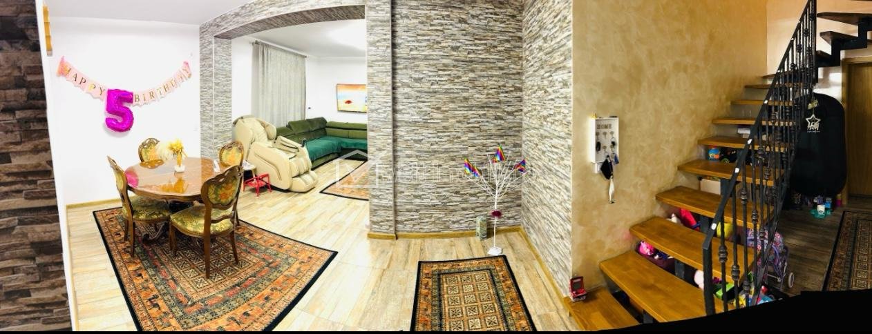 Caracteristici Tip locuinta Casa Numar camere 5 Numar bucatarii 1 Numar bai 2 Parcare da Beci nu Gradina nu Suprafata utila 200 m2 Suprafata construita 240 m2 Suprafata teren 748 m2 Front 16.5 m Etaj 1 Struct. rezistenta BCA Disponibilitate imediat Descrierea Casei Welt Imobiliare intermediaza vanzare unei case individuale, situata in Apahida, pe o strada retrasa, linistita si putin circulata. Avand o suprafata de 200 m.p. utili, te vei bucura de un ambient confortabil. Finisajele de înalta calitate si lumina naturala creeaza un spatiu prietenos si primitor. Casa este construita pe 2 niveluri: P+1E+Pod, compartimentarea fiind dupa cum urmeaza: -La parter: hol acces, casa scarii, 1 dormitor(birou), living+bucatarie open-space, cu iesire pe o terasa acoperita, generoasa, de 40 m.p., 1 baie, 1 dressing+ camera tehnica; -La etaj: hol acces si sunt prevazute 3 dormitoare si 1 baie. Spatiul prevazut pentru cele 3 dormitoare, nu este delimitat, fiind amenajat pe tot nivelul intr-o singura camera mare, tip studiou. Baia nu este finalizata, fiind in stadiul de semifinisat; -Podul este foarte generos, existand posibilitatea mansardarii lui. In prezent este utilizat, ca spatiu de depozitare; Casa are o curte generoasa, de 750 mp, cu o mica gradina de pomi fructiferi, avand alei pavate si gazon pe toata suprafata acesteia. Exista si un loc de joaca amenajat pentru copii, in spatele casei. Are o parcare pentru 4 masini. Detalii tehnice si de constructie: izolatie cu vata bazaltica de 10 cm, geamuri termopan, centrala pe gaz de 35 kw, incalzire prin pardoseala la parter, iar la etaj prin calorifere. C.F. curat, acte in regula; Pentru o vizionare nu ezitati sa ne contactati! Echipa Welt Imobiliare! ID Proprietate: P 50785 ID Proprietate - P50785 Finisaje Izolatii termice (Exterior), Pereti (Vopsea lavabila, Faianta), Podele (Parchet, Gresie), Ferestre cu geam termopan (PVC), Usa intrare (PVC), Usi interior (Lemn) Vecinatati si puncte de interes in zona Amenajare strazi (Asfaltate), Iluminat stradal, Mijloace de transport in comun Numar vizualizari: 463 Actualizat: 2025-11-07 10:24:06
