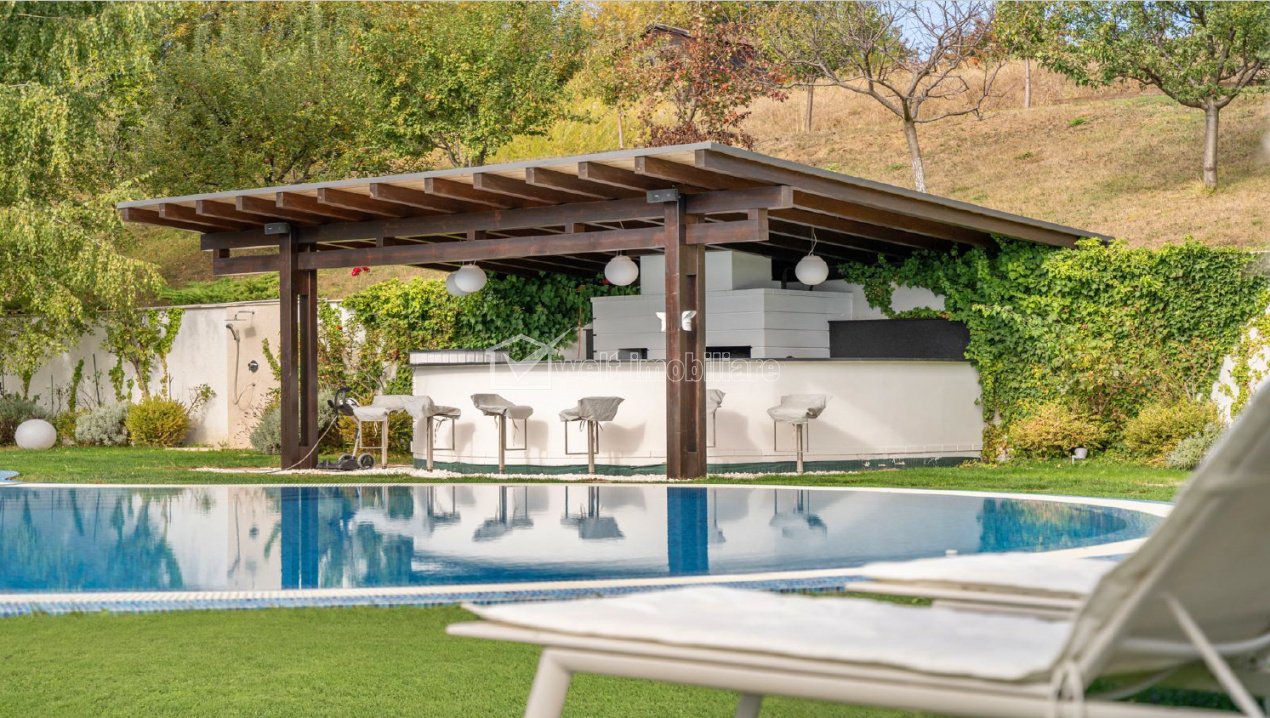 Casa individuala premium| piscina exterioara |Teren 3730 mp| la 11 km de Cluj Rediu 5 camere • 450 m2 • 3730 m2 terenmobilat lux pret vanzare 1.390.000 € + 16 + 13 Caracteristici Tip locuinta Casa Numar camere 5 Numar bucatarii 1 Numar bai 5 Numar garaje 1 Parcare da Beci nu Gradina da Suprafata utila 450 m2 Suprafata construita 540 m2 Suprafata teren 3730 m2 Front 30 m Struct. rezistenta Caramida An constructie 2016 Disponibilitate imediat Descrierea Casei Vă prezentăm o proprietate de excepție situată într-o zonă rezidențială noua ,in comuna Aiton. Această vilă individuală impresionează prin eleganta arhitecturala, spatiul oferit , finisajele premium și facilitățile care oferă un stil de viață rafinat și relaxant. Accesul este foarte facil atat spre centrul Clujului (20 minute)cat si la nodul de autostrada de la Tureni de unde se ajunge in aproximativ 10-15 minute la Aeroportul International Avram Iancu Cluj. Parter – Spații generoase, lumină naturală și confort absolut: Zonă de zi open-space, inundată de lumină prin ferestre ample, cu un design aerisit și elegant; Living spațios, ideal pentru momente de familie sau întâlniri sociale; Bucătărie ultramodernă, complet echipată cu aparatură Miele; Dining ce poate acomoda 10 persoane; Cămară și dressing organizate eficient; Dormitor de oaspeți cu baie privată, oferind intimitate completă; Birou elegant, perfect pentru lucrul de acasă; Baie de serviciu; 2 dormitoare pentru copii + baie proprie modernă; Dormitor matrimonial spectaculos, cu dressing spațios și baie privată de lux; Subsol – Funcționalitate și relaxare într-un spațiu dedicat: Cameră de hobby cu masă de biliard, dotata cu sistem performant de ventilație cu aport de aer proaspăt; Două spații de depozitare mari, excelent organizate; Spălătorie și cameră tehnică; Sală de sport pentru activități zilnice și menținerea unui stil de viață activ; Baie cu saună și perete decorativ din sare naturală, pentru efecte benefice asupra sănătății și un plus de rafinament. Se vinde complet mobilată și utilată, cu electrocasnice și echipamente premium (Miele, Bang & Olufsen, Villeroy & Boch). Sistem smart home, care permite controlul inteligent al iluminatului, temperaturii și securității. Jaluzele electrice integrate, automatizate prin stație meteo inteligentă. Sistem de securitate de înaltă performanță, cu alarmă și supraveghere video. Încălzire cu centrală termică pe gaz, ventiloconvectoare. Panouri fotovoltaice de 25 kW, care asigură autonomie energetică. Elementul central al grădinii este o spectaculoasă piscină exterioară încălzită, cu 185 mp luciu de apă. Garaj dublu. Terasă acoperită ideală pentru relaxare în aer liber. Loc de joaca pentru copii. Foisor pentru Barbecue si Bar. Daca v-am starnit interesul cu aceasta proprietate, va invitam sa o vedeti! ID Proprietate - P49965 Vecinatati si puncte de interes in zona Amenajare strazi (Asfaltate) Numar vizualizari: 55 Actualizat: 2026-02-04 16:08:25