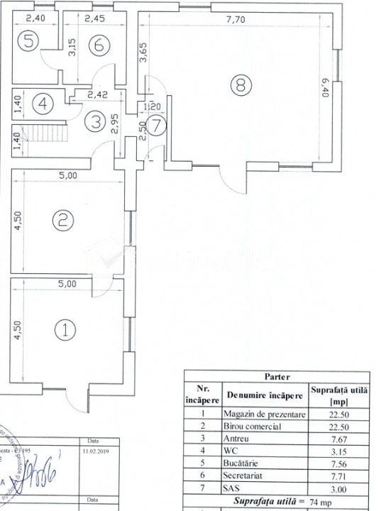 Spațiu de birouri de vânzare – zonă premium Grigorescu Cluj-Napoca, Grigorescu 5 camere • 153 m2 pret vanzare 380.000 € + 4 Caracteristici Tip spatiu Birou Suprafata utila 153 m2 Nr. incaperi 5 Bai 2 Terase -- Nr. parcari 3 Nr. garaje 1 Tip imobil -- Clasa birouri -- Etaj /1 Regim de inaltime 1E Constructie din Caramida Anul constructiei -- Sup. construita 253 m2 Suprafata curte -- Disponibilitate imediat Descrierea spatiului Va propunem spre vânzare o clădire cu destinație comercială și de birouri, situată în cartierul Grigorescu, într-o zonă cu vad foarte bun, în imediata apropiere a stației de autobuz, cu acces facil și vizibilitate excelentă din stradă. Imobilul este dispus pe două niveluri (parter și mansardă) și are o suprafață construită desfășurată de 253 mp, respectiv o suprafață utilă de 153 mp. Este ideal pentru activități de birou, servicii sau cabinete și reprezintă o oportunitate excelentă de investiție, fiind în prezent închiriat către chiriași stabili, cu randament imediat. Teren total: 299 mp Front stradal: 13,5 metri Compartimentare: Parter: 3 birouri, baie, antreu, scară interioară Mansardă: 2 birouri, hol, baie Construcția este solidă, realizată pe fundații din beton armat, cu zidărie din cărămidă și acoperiș tip terasă. Beneficiază de garaj auto și curte proprie, care poate fi utilizată pentru parcare, zonă de relaxare sau extindere. Caracteristici principale: Zonă cu vad comercial, trafic pietonal și rutier intens Acces imediat la mijloacele de transport în comun Spațiu luminos, bine întreținut Proprietate închiriată, cu venit pasiv garantat Posibilitate de parcare în curte Acces auto facil Dotări și utilități: Centrală termică proprie Contorizare individuală Utilități complete Posibilitate de recompartimentare și personalizare Pentru informații suplimentare sau pentru programarea unei vizionări, vă invităm să ne contactați. Această proprietate oferă combinația perfectă între amplasare, funcționalitate și potențial investițional. ID Proprietate - P48960 Utilitati Utilitati generale: Electricitate, Curent trifazic, Apa, Gaz, CanalizareSistem de incalzire: Centrala termica, CalorifereClimatizare: Aer conditionat Finisaje: Podele (Parchet, Gresie) Numar vizualizari: 1608 Actualizat: 2025-10-16 10:31:59