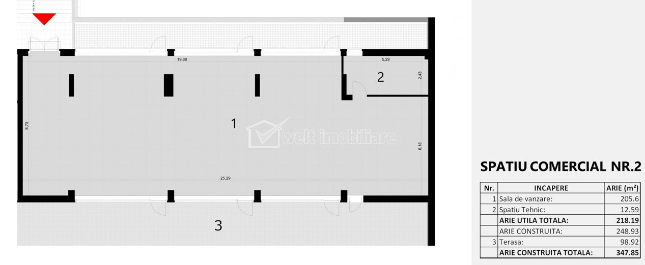 Spatiu comercial 220mp + 99mp terasa, Golden Tulip Zorilor Cluj-Napoca, Zorilor 1 camera • 348 m2 pret vanzare negociabil 436.800 € + TVA + 4 Caracteristici Tip spatiu Spatiu Comercial Suprafata utila 348 m2 Nr. incaperi 1 Bai 2 Terase 1 Nr. parcari -- Nr. garaje -- Tip imobil bloc Etaj parter/4 Regim de inaltime 4E Constructie din Beton Anul constructiei 2025 Sup. construita 348 m2 Suprafata curte -- Disponibilitate imediat Descrierea spatiului Vanzare spatiu comercial sau servicii in zona Golden Tulip Zorilor. Situat la parterul unui ansamblu rezidential nou, intr-o pozitie cu vedere panoramica asupra Manasturului Spatiul se compune din 220mp sala de vanzare si 99mp terasa proprie, la stadiul semifinisat. Se pot achizitiona locuri de parcare subterane. Vanzare sub regim TVA. ID Proprietate - P50774 Utilitati Utilitati generale: Electricitate, Apa, Gaz, Canalizare, Cablu TV Finisaje: Izolatii termice (Exterior), Ferestre cu geam termopan (Aluminiu), Iluminat (Lumina naturala) Dotari: Contorizare (Nemobilat), Dotari imobil (Videointerfon, Lift, Spatii agrement, Curte), CFR Vecinatati si puncte de interes in zona Golden Tulip Zorilor, Liceul Waldorf Numar vizualizari: 558 Actualizat: 2025-10-02 19:35:07