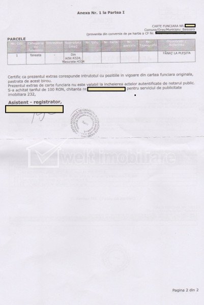 Baisoara - Muntele Filii, acces prin Moara de Padure, 4324 mp, deosebit Baisoara teren extravilan • 4324 m2 • front 73 m pret vanzare negociabil 32.500 € 25.500 € comision 0% la cumparare • + 9 + 6 Vandut Exclusivitate Caracteristici Tip imobil Teren extravilan Padure Suprafata 4324 m2 Front 73 m Nr. fronturi 1 Latime drum acces 6 m Vecinatati si puncte de interes in zona Amenajare strazi (Neamenajate, De pamant) Descrierea terenului Iti doresti un loc unde sa respiri un aer bun, sa ridici casa visurilor tale, sa ai retreat-ul tau sau chiar sa dezvolti o afacere in turism? Welt Imobiliare va aduce in atentie posibilitatea achizitionarii unui teren pretabil la toate cele mentionate si chiar mai mult. Extravilan, cu vegetatie adulta, aerisit si in acelasi timp suficient de mare pentru a nu auzi vecinii, terenul propus vanzarii poate fi ideal pentru o casa, cabana, pensiune sau chiar pentru un camping- retreat in inima naturii. Cu vedere peste Cetatea Liteni, locatia este absolut deosebita. Terenul este intabulat, detine CF, este imprejmuit. Accesul se realizeaza din Moara de Padure, 1,8 km drum forestier. Auto 4x4 necesar pentru acces. Curentul electric trece la 10 metri de limita proprietatii. Izvor subteran cu debit bun, posibil a fi captat. Poziție cu elevatie ridicată (800m), este insorit si cu o panorama deosebita. Taxele sunt la zi, toate actele in regula. Exclusivi prin Welt Imobiliare. ID P27829 ID Proprietate - P27829 Utilitati Utilitati in apropiere Numar vizualizari: 835 Actualizat: 2022-01-20 12:38:50