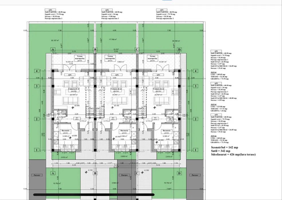 + 6 + 3 Vandut Caracteristici Tip imobil Teren intravilan Teren pentru constructii civile Suprafata 509 m2 Nr. fronturi 1 Vecinatati si puncte de interes in zona Amenajare strazi (Asfaltate) Descrierea terenului Welt Imobiliare va prezinta o oportunitate unica de investitie / dezvoltare rezidentiala Teren cu proiect autorizat pentru constructia a 3 case insiruite moderne, situat in Floresti, judetul Cluj. Proiectul permite inceperea imediata a lucrarilor, fiind ideal pentru investitori sau dezvoltatori imobiliari. Caracteristici teren si proiect: Suprafata teren: 509 mp + 124 mp cota parte drum de acces. Suprafata construita la sol: 142 mp. Suprafata desfasurata: 426 mp (fara terase). Suprafata utila totala: 342 mp. Toate utilitatile disponibile la frontul parcelei. Configuratie case insiruite: Casa 1 Suprafata utila: 109.05 mp. Terase: 32.3 mp. Gradina: 73.7 mp. Parter: 40.50 mp utili, terasa 10.30 mp, parcare supraterana. Etaj: 42.5 mp utili, terasa 2.57 mp. Etaj retras: 26.05 mp utili, terasa 19.41 mp. Casa 2 Suprafata utila: 123.8 mp. Terase: 17.72 mp. Gradina: 24 mp. Parter: 40.50 mp utili, terasa 10.30 mp, parcare supraterana. Etaj: 42.5 mp utili, terasa 2.47 mp. Etaj retras: 40.80 mp utili, terasa 4.95 mp. Casa 3 Suprafata utila: 109.05 mp. Terase: 32.3 mp. Gradina: 73.7 mp. Parter: 40.50 mp utili, terasa 10.30 mp, parcare supraterana. Etaj: 42.5 mp utili, terasa 2.57 mp. Etaj retras: 26.05 mp utili, terasa 19.41 mp. Avantaje: Zona cu potential ridicat de dezvoltare in Floresti. Proiect modern, conceput pentru eficienta si functionalitate. Posibilitate de personalizare a constructiei. Contacteaza-ne pentru mai multe detalii! ID Proprietate - P46258 Utilitati Apa, Canalizare, Gaz, Curent electric Numar vizualizari: 579 Actualizat: 2025-03-24 16:30:41