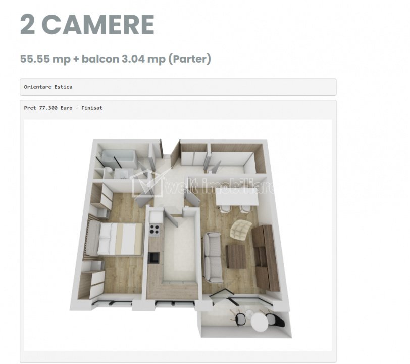Appartement 2 chambres à vendre dans Floresti Floresti 2 chambres • 55.55 m2 • 1 salle de bain • étage rez-de-chaussée/2 • decomandatfinisat • nemobilat prix de vente 77 300 € Caractéristiques Type de bien Appartement Non. Chambres 2 Non. cuisines 1 Non. salles de bains 1 Non. balcons 1 Le stationnement non Surface construite 68 m2 Surface utile 55.55 m2 Compartiments Decomandat Etage rez-de-chaussée/2 Construit avec Brique Construction 2025 Description de l'appartement Welt Imobiliare vous propose d'acquérir un appartement 2 pièces avec balcon, situé dans un immeuble de type P+2+ER, faisant partie d'un projet immobilier en plein essor à Floresti, dans le quartier de Cetatea Fetei. Ce bien bénéficie d'un emplacement magnifique et récent, offrant un accès facile aux sites touristiques. Un emplacement entouré d'espaces verts, d'un jardin d'enfants récemment construit, de commerces et d'une gare routière. Un projet qui met l'accent sur l'amélioration de la qualité de vie. Dans la description et les photos de présentation, nous avons sélectionné un appartement de 55,55 m² avec un balcon de 3 m², situé au rez-de-chaussée. L'appartement est indépendant et se compose comme suit : couloir ; salle de bains ; dressing ; cuisine ; séjour avec balcon, chambre. Pour les appartements 2 pièces situés à l'étage intermédiaire, le prix est de 89 000 euros. Pour plus d'informations, n'hésitez pas à nous contacter. ID de la propriété - P46629 Utilités, Finissages Utilités générales: Électricité, Eau, GazSystème chauffage ChauffageFinissages Parquet, Grès, Faïence, Lavable, Portes intérieures Nombre de vues: 1603 Réactualiser: 2025-10-21 10:09:21