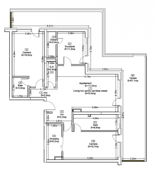 Appartement 3 chambres à vendre dans Cluj-napoca, zone Zorilor Cluj-Napoca, Zorilor 3 chambres • 114 m2 • 3 salles de bains • étage /14 • decomandatnemobilat prix de vente négociable 332 500 € + VAT + 18 + 15 Caractéristiques Type de bien Penthouse Non. Chambres 3 Non. cuisines 1 Non. salles de bains 3 Nombre de terrasses 1 Le stationnement non Surface construite 171 m2 Surface utile 114 m2 Compartiments Decomandat Confort Marit Etage /14 Construit avec Ciment Construction 2025 Description de l'appartement Appartement penthouse dans un immeuble neuf du quartier Lidl Frunzisului, offrant une superbe vue panoramique et une orientation sud-est. Surface habitable de 114 m² et terrasse panoramique de 57 m² accessible depuis chaque pièce. Il comprend un vaste séjour avec coin repas, une cuisine séparée avec cellier et des toilettes dans le couloir. Une chambre double de 35 m² avec dressing, salle de bains privative et accès à la terrasse. Une deuxième chambre avec salle de bains privative et accès à la terrasse. L'appartement est vendu semi-fini, avec chauffage central au gaz individuel, chauffage au sol, installations électriques en place et murs enduits. Place de parking extérieure disponible au prix de 12 000 € HT. ID de la propriété - P51614 Utilités, Finissages Utilités générales: Électricité, Eau, Gaz, Evacuation des eaux usées, TV CâbleSystème chauffage Chauffage, Chauffage par le plancherEquipements Compteurs gaz Nombre de vues: 297 Réactualiser: 2025-11-07 17:31:07