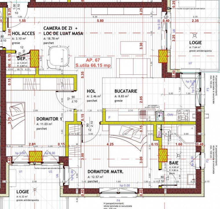 + 8 + 5 Caractéristiques Type de bien Appartement Non. Chambres 3 Non. cuisines 1 Non. salles de bains 1 Non. balcons 2 Le stationnement non Surface utile 66.15 m2 Compartiments Decomandat Confort 1 Etage 3/6 Construit avec Brique Description de l'appartement Nous vous proposons un nouveau projet immobilier situé dans le quartier le plus accessible de Floresti, rue Tineretului, près de Somes. Le projet se compose de quatre bâtiments de plain-pied (S+R+6E) comprenant des espaces commerciaux au rez-de-chaussée, des espaces verts et des allées piétonnes. Les blocs sont en briques et sont équipés du chauffage individuel par appartement, du chauffage au sol, du triple vitrage, d'une porte anti-effraction et d'un ascenseur. Les appartements sont livrés finis et comprennent : carrelage, carrelage au sol, parquet, portes intérieures, sanitaires, prises, interrupteurs et luminaires. Les prix indiqués incluent la TVA. Un parking souterrain est disponible moyennant un supplément. Date de livraison : décembre 2025 ID de la propriété - P46854 Utilités, Finissages Utilités générales: Électricité, Eau, Gaz, Evacuation des eaux usées, TV CâbleSystème chauffage Chauffage, Chauffage par le plancherFinissages Parquet, Grès, Lavable Nombre de vues: 1796 Réactualiser: 2025-11-25 14:53:34