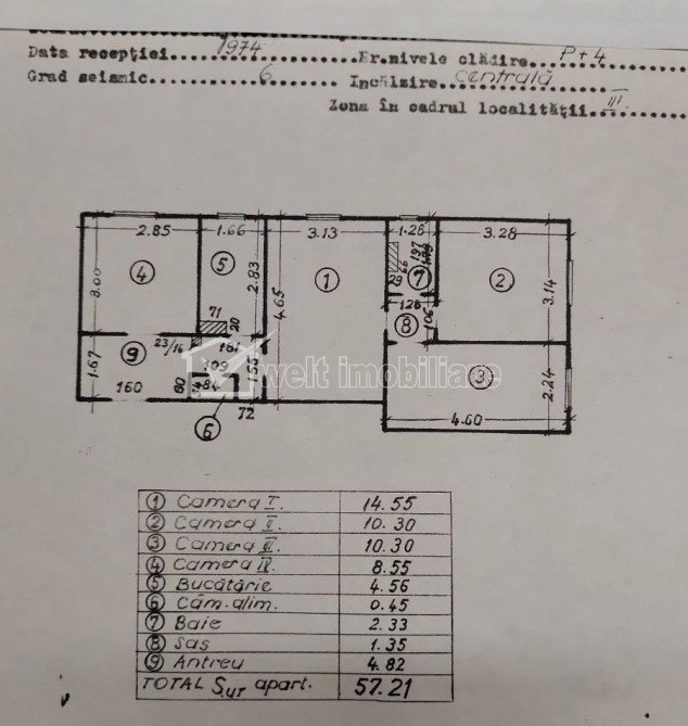 Appartement 4 chambres à vendre dans Cluj-napoca, zone Manastur Cluj-Napoca, Manastur 4 chambres • 57 m2 • 1 salle de bain • étage 3/4 • decomandatstare buna • mobilat partial prix de vente négociable 110 000 € + 8 + 5 Vendu Caractéristiques Type de bien Appartement Non. Chambres 4 Non. cuisines 1 Non. salles de bains 1 Le stationnement non Surface construite 67 m2 Surface utile 57 m2 Compartiments Decomandat Confort 1 Etage 3/4 Construit avec Ciment Construction 1980 Description de l'appartement Welt Imobiliare agence Cluj-Napoca offre pour vente appartement avec 4 chambres, situé à Cluj-napoca, zone Manastur. D'appartement confort 1 decomandat est situé à etages 3 dans un bloc avec 4 etages, a 1 cuisine, 1 salle de bain .D'appartement est stare buna a parquet, grès, faïence, Lavable, chauffage. Certaines finitions sont: pereti (vopsea lavabila, faianta), podele (parchet, gresie), stare interior (buna), ferestre cu geam termopan (pvc), usa intrare (metal) Les dotations de l'esprit: alte spatii utile (debara), bucatarie (partial mobilata), contorizare (apometre), mobilat (partial), dotari imobil (interfon) ID de la propriété - P39401 Utilités, Finissages Utilités générales: Électricité, Eau, Gaz, Evacuation des eaux uséesSystème chauffage Chauffage, Chauffage, RadiateursFinissages Parquet, Grès, Faïence, Lavable Nombre de vues: 824 Réactualiser: 2023-10-20 09:56:46