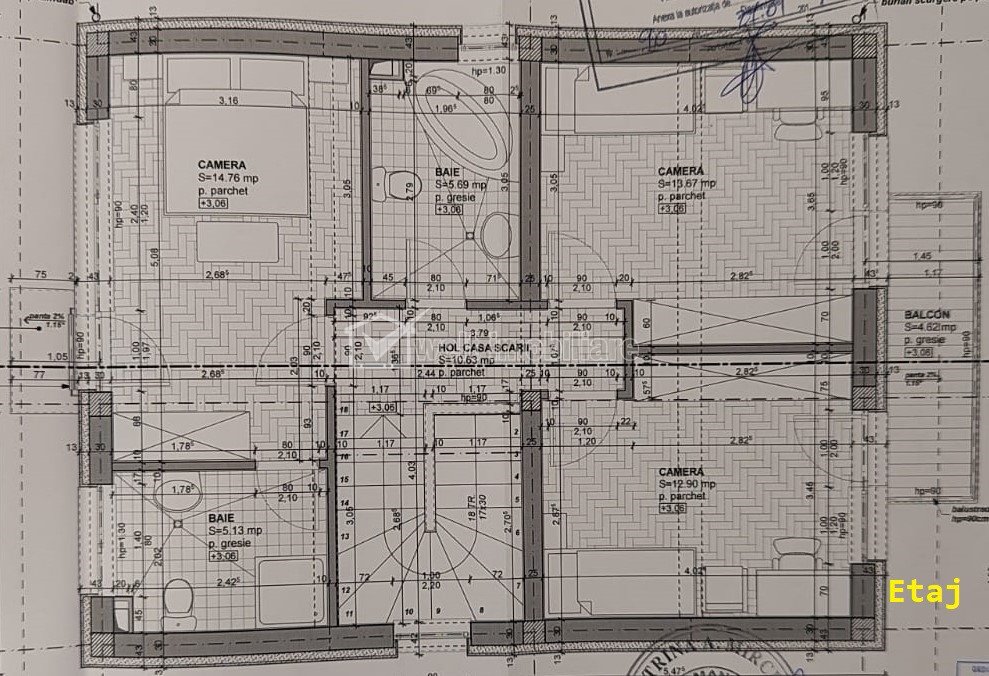 Caractéristiques Type de bien Maison Non. Chambres 5 Non. cuisines 2 Non. salles de bains 3 Non. balcons 2 Nombre de terrasses 2 Surface terrasse 26.00 mp Non. de garages 1 Le stationnement oui Sous-sol non Jardin oui Surface utile 157 m2 Surface construite 213 m2 Surface terrain 452 m2 No. fronts 18.25 m Etage 1 Struct. résistance Ciment Construction 2018 Finissages: Parquet, Grès, Portes intérieures